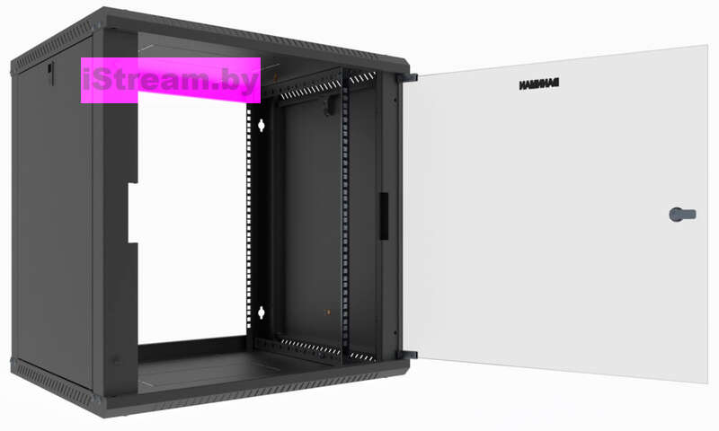 Каркас шкафа выполнен из стали с порошковым покрытием RAL9005 (черный). Съемные боковые стенки оснащены замками, обеспечивая быстрый доступ к оборудованию при обслуживании. Монтажная высота 9U (500 мм) позволяет размещать расширенные конфигурации коммутационного оборудования и патч-панелей. Максимальная нагрузка конструкции составляет 65 кг.
